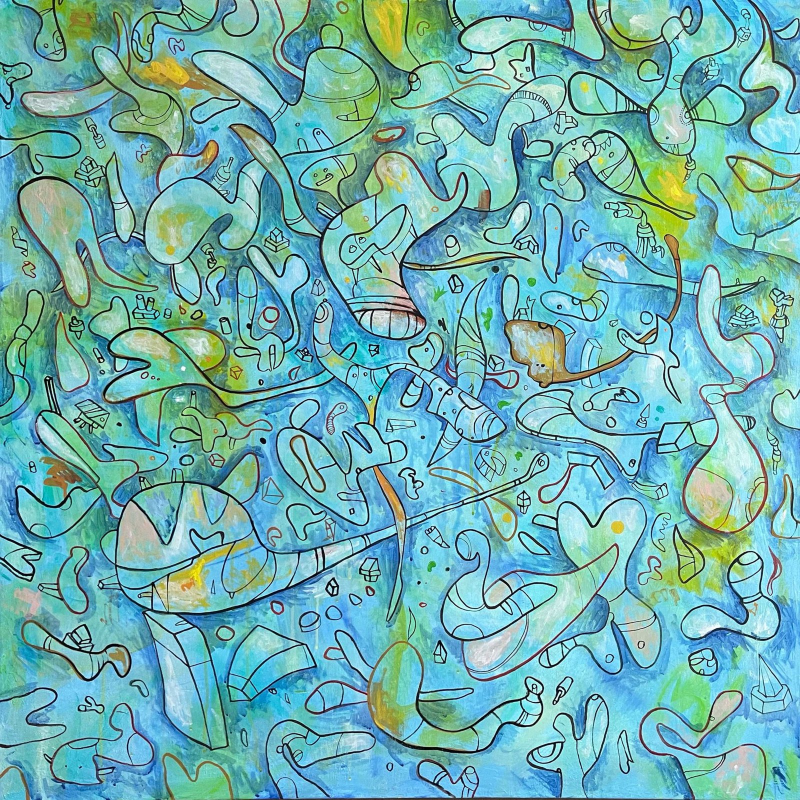 Penguins In The City, 2026, acrylics on canvas, 100×100 cm.